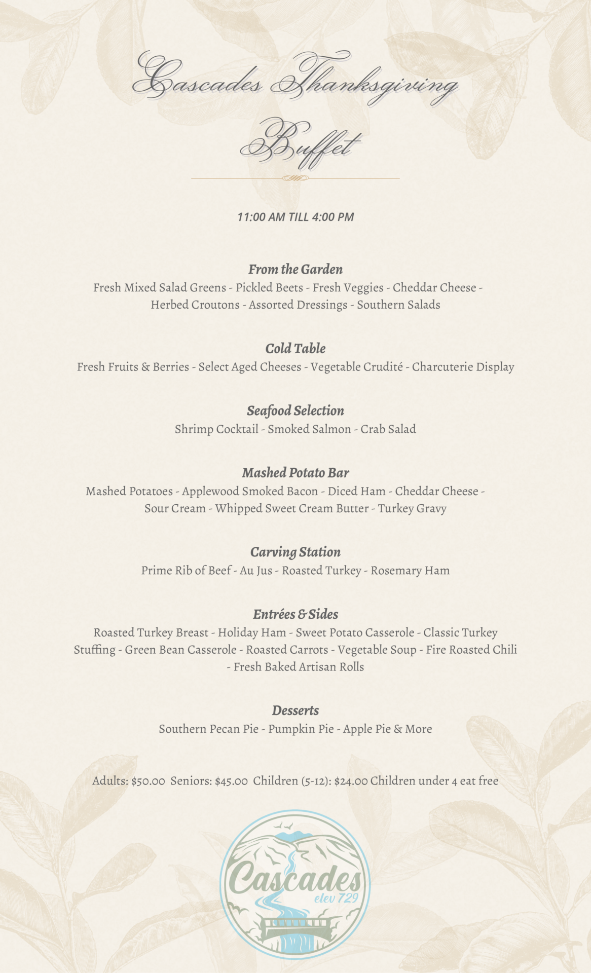 Join us in Cascades for a traditional Thanksgiving Day Buffet on Thursday, November 27, 2025 from 11am to 4pm. Adults are $50. Seniors are $45. Children 5 – 12 are $24 and Children under 4 eat free. Reserve your table online today at https://reservations.shift4payments.com/#/83303058-d870-4b8e-893d-42dfb13b3947